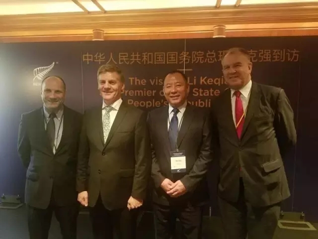 大莊園實業集團董事長陳希濱與新西蘭總理比爾·英格利希(右三)、現任新西蘭駐華大使約翰·麥康年(右一)、阿蘭茨CEO大衛·斯維爾(右四)合影
